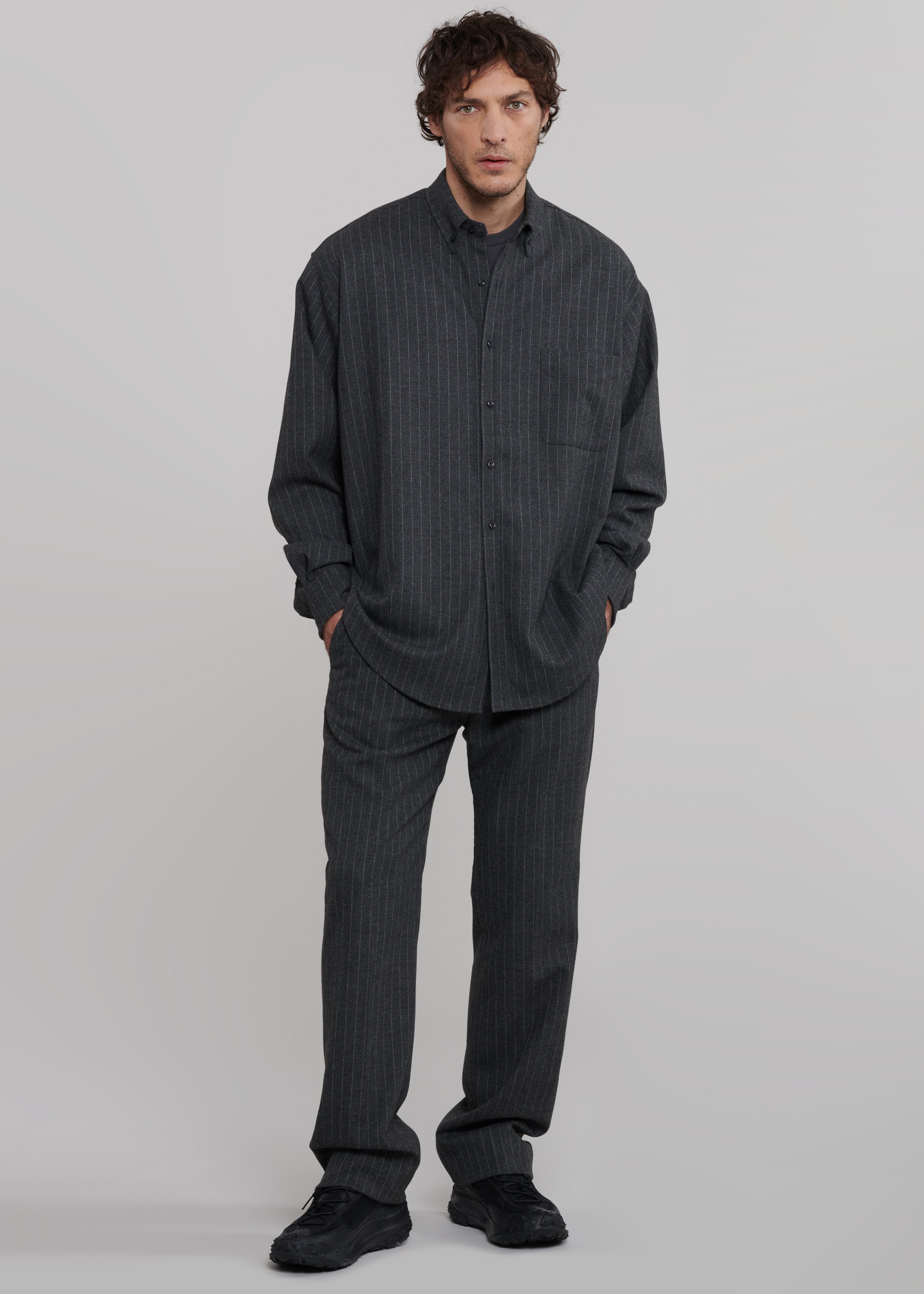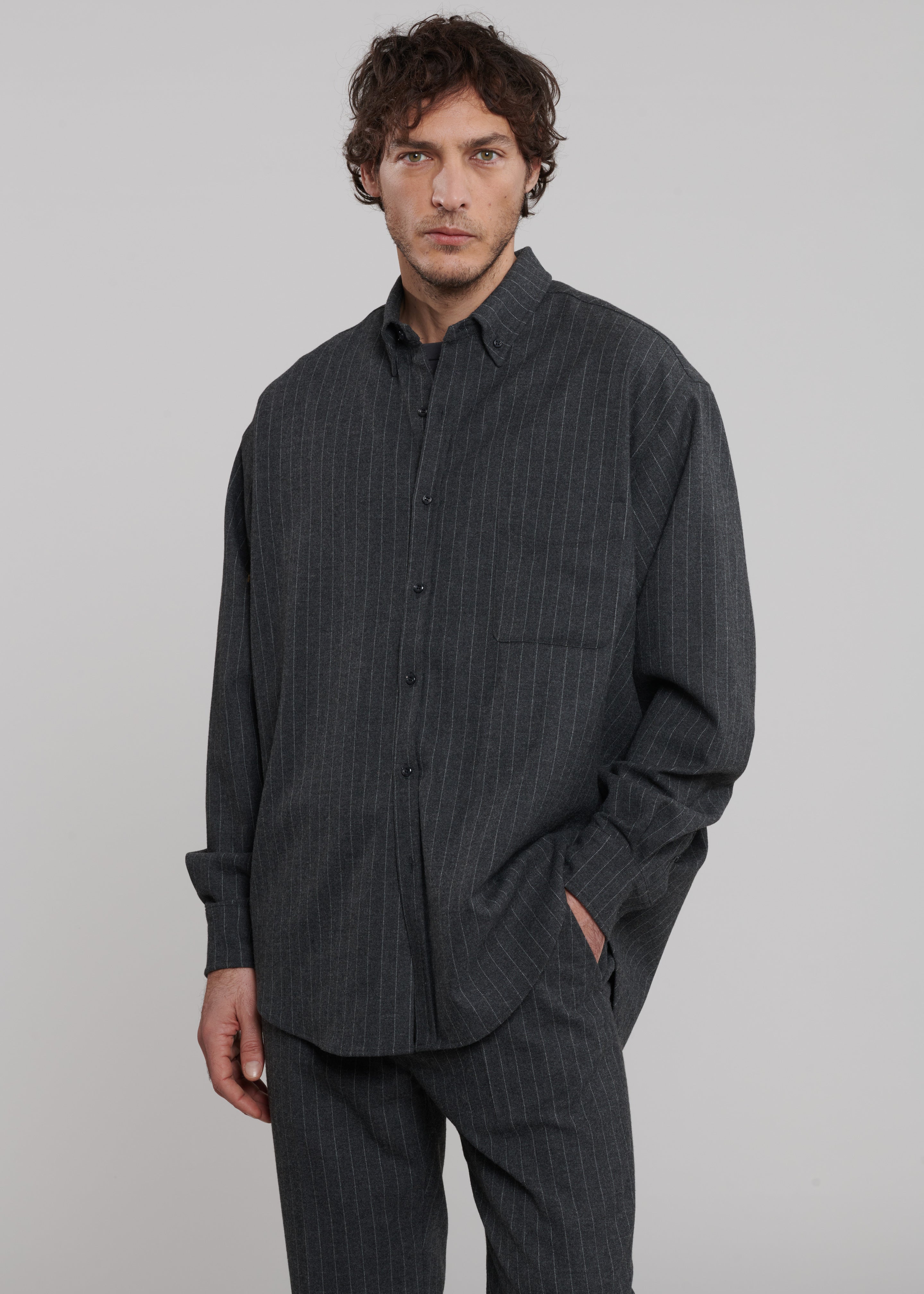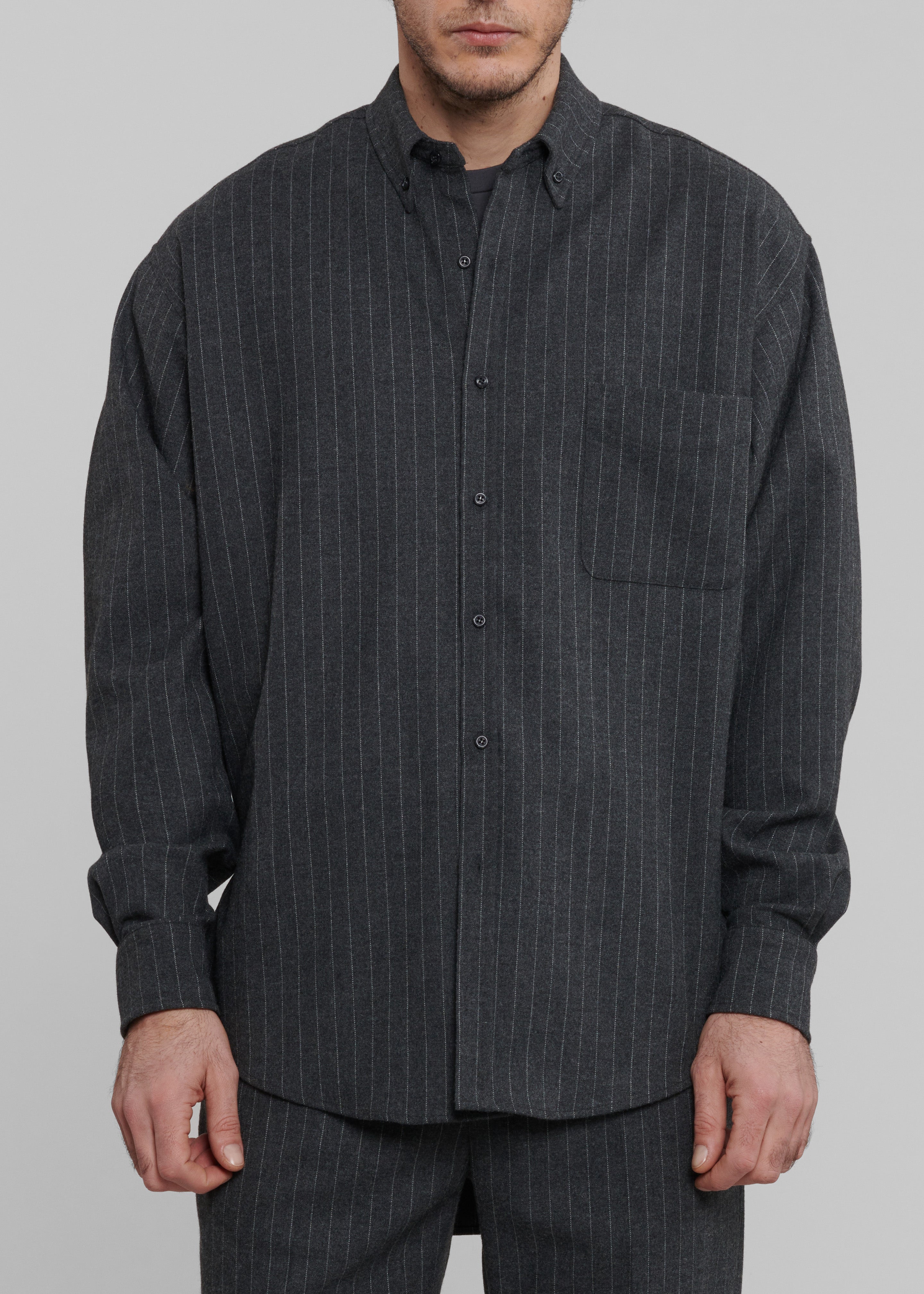 Mason Wool Button Up Shirt - Dark Grey/White Pinstripe